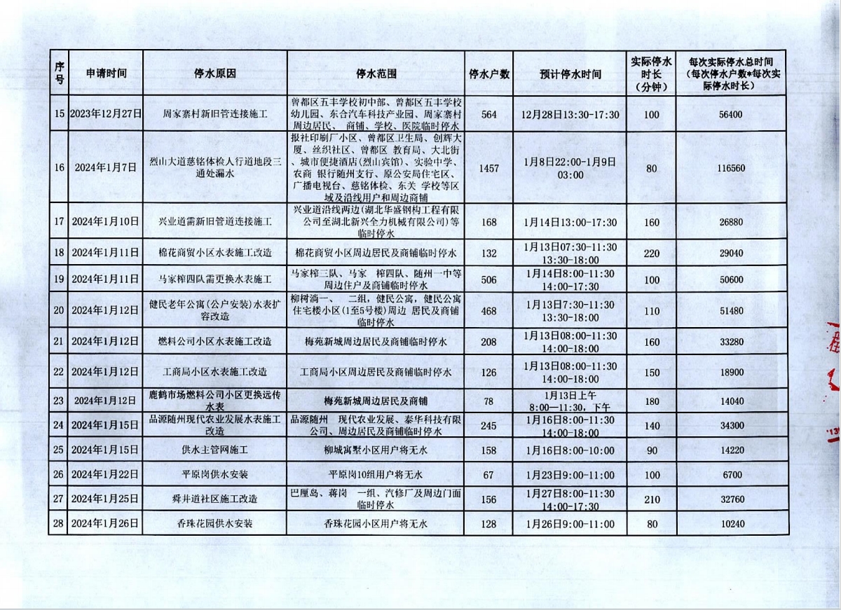 隨州市2023年9月至2024年8月計(jì)劃性停水資料